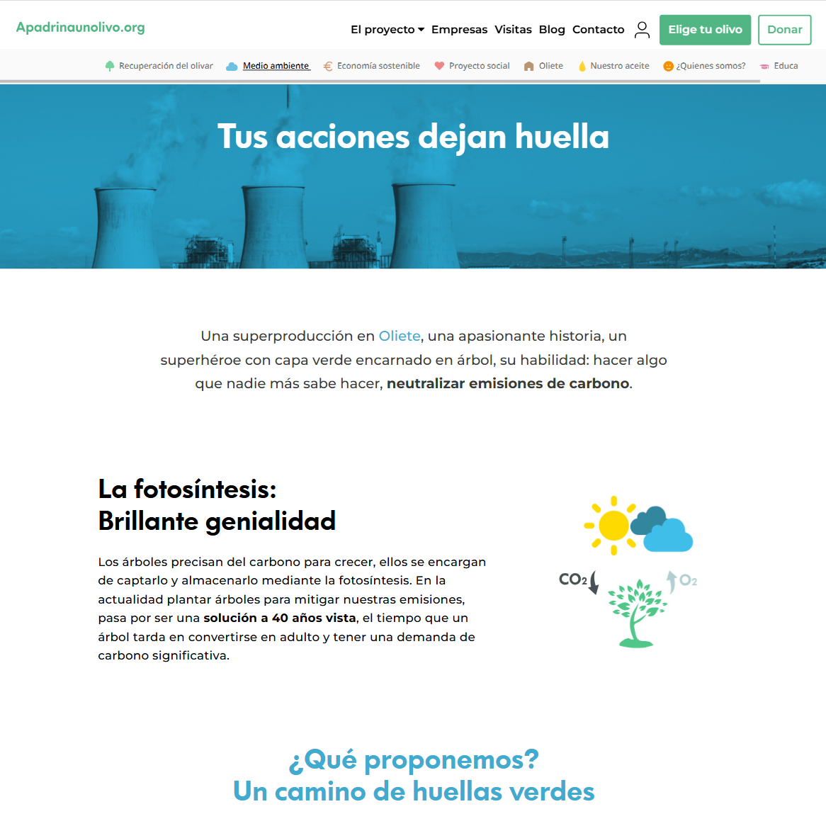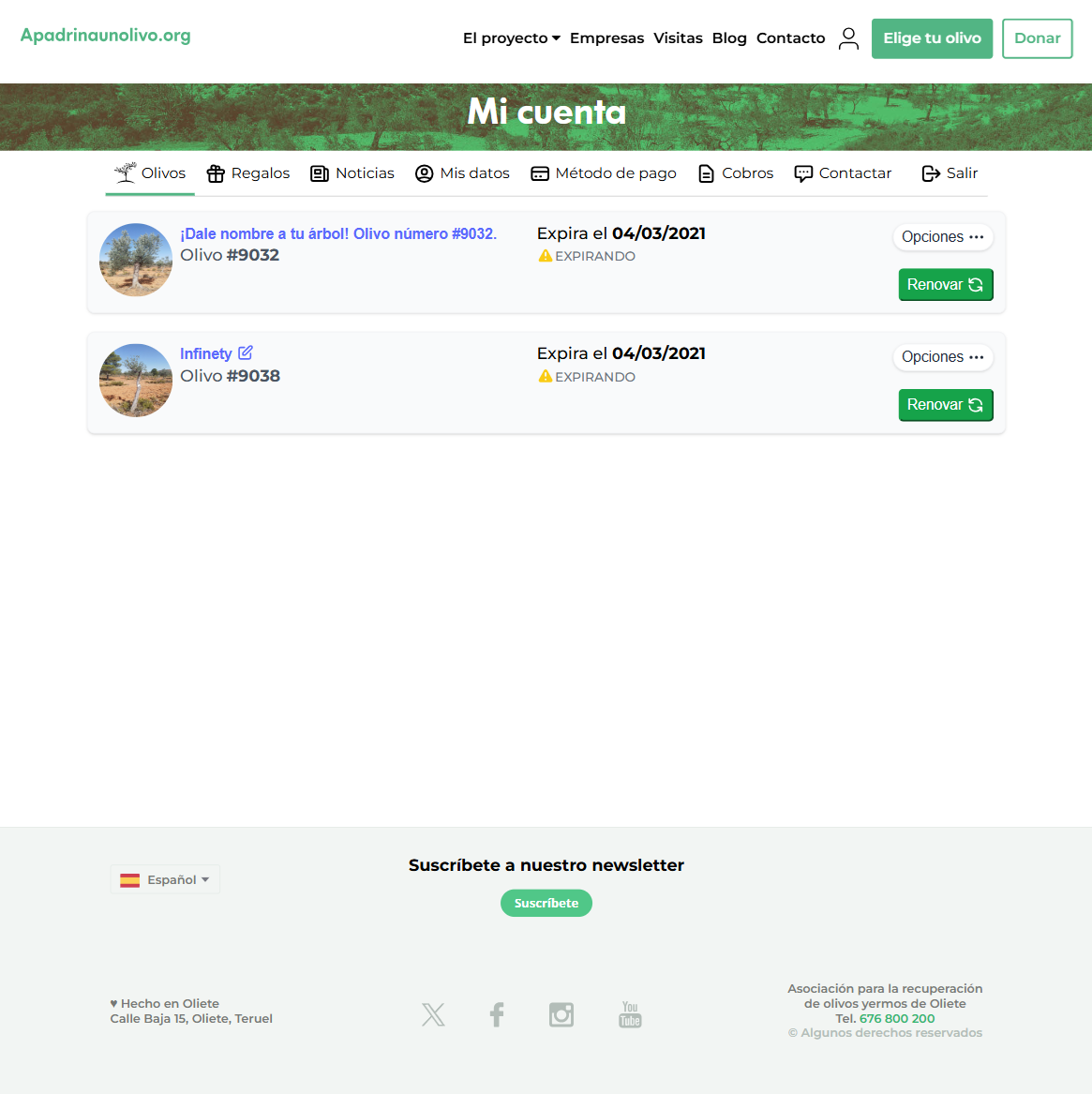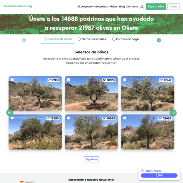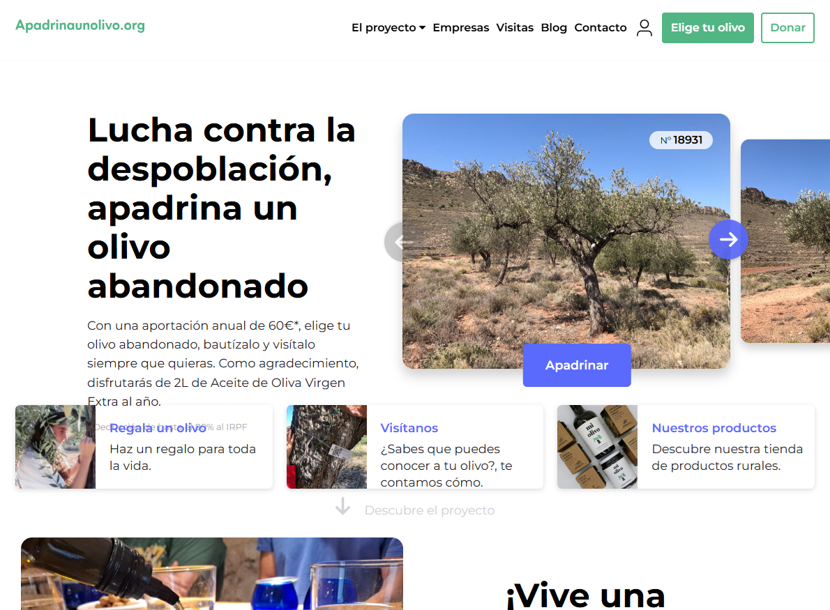 Apadrina un Olivo es una plataforma creada para conectar a personas con el proyecto de revitalización de olivos centenarios en Oliete, un pequeño pueblo de Teruel, España. El sitio permite a los usuarios patrocinar un olivo, ayudar a su conservación, y contribuir al desarrollo sostenible de la región, promoviendo la recuperación de la biodiversidad y apoyando la economía local. Además, a través de la plataforma, los patrocinadores pueden recibir actualizaciones de sus olivos, fotos, y detalles sobre el progreso de su apadrinamiento y el impacto en la comunidad.